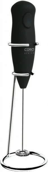 Milchaufschäumer mit Edelstahlfeder, hohe Drehzahl für schnelles Aufschäumen von Milch, Kakao und Milchshakes, gummierter Griff für guten Halt, mit Edelstahl-Standfuß, Maße (BxHxT): 4,7 x 25 x 3,2 cm, Batterien: 2x 3V (AA) (nicht enthalten).