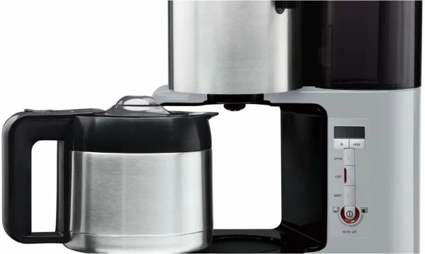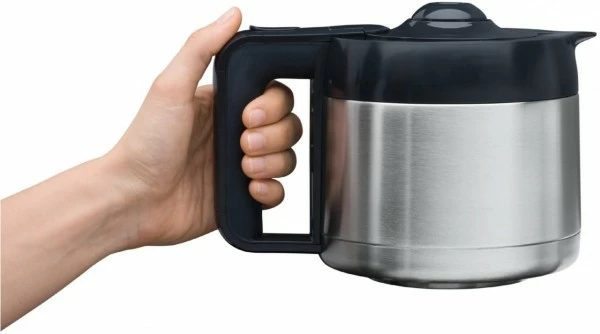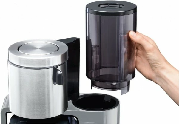 - Edelstahl-Thermokanne: aromaschonend, mit Durchbrühdeckel und Bajonettverschluss – ergonomischem soft-touch-Griff