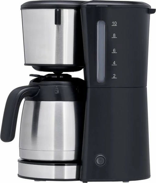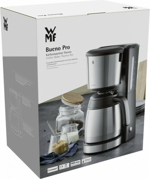 Mit ihrem schlichten und eleganten Design sowie dem Gehäuse aus hochwertigem mattgebürsteten Cromargan® fügt sich die WMF Bueno Pro Kaffeemaschine mühelos in jedes Küchenambiente ein. Mühelos und komfortabel ist auch die Bedienung: Mit Hilfe der außenliegenden Wasserstandsanzeige erfolgt die Portionierung auf die Tasse genau. Bis zu 10 Tassen à 125 ml duftenden Kaffees passen dabei in die Thermoskanne, die bei Bedarf stundenlang die optimale Trinktemperatur hält. Und auch das Kaffeepulver selbst wird dank des Schwenkfilters bequem und krümelfrei eingefüllt. Danach genügt ein einfacher Druck auf die Start-/Stopptaste (mit Kontrollleuchte) und dem baldigen Kaffeegenuss steht nichts mehr im Wege. Der Filtereinsatz (1 x 4) ist zum Reinigen entnehmbar und so konstruiert, dass ein Nachtropfen oder gar Überlaufen ausgeschlossen ist.